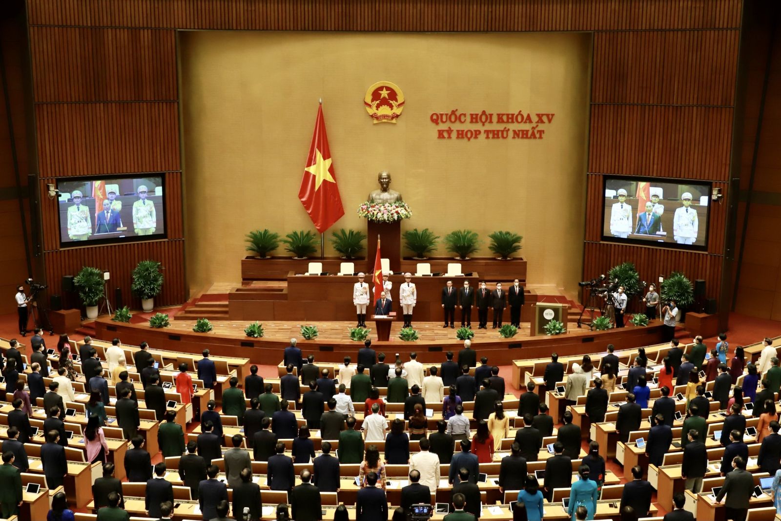 “Hôm nay dưới lá cờ đỏ sao vàng, tôi xin hứa trước Quốc hội và đồng bào sẽ luôn tu dưỡng đạo đức, cần kiệm liêm chính, chí công vô tư, thượng tôn pháp luật và tuyệt đối tuân thủ Hiến pháp, thực hiện trọn vẹn đầy đủ mọi nhiệm vụ, quyền hạn của Chủ tịch nước”, Chủ tịch nước Nguyễn Xuân Phúc phát biểu.