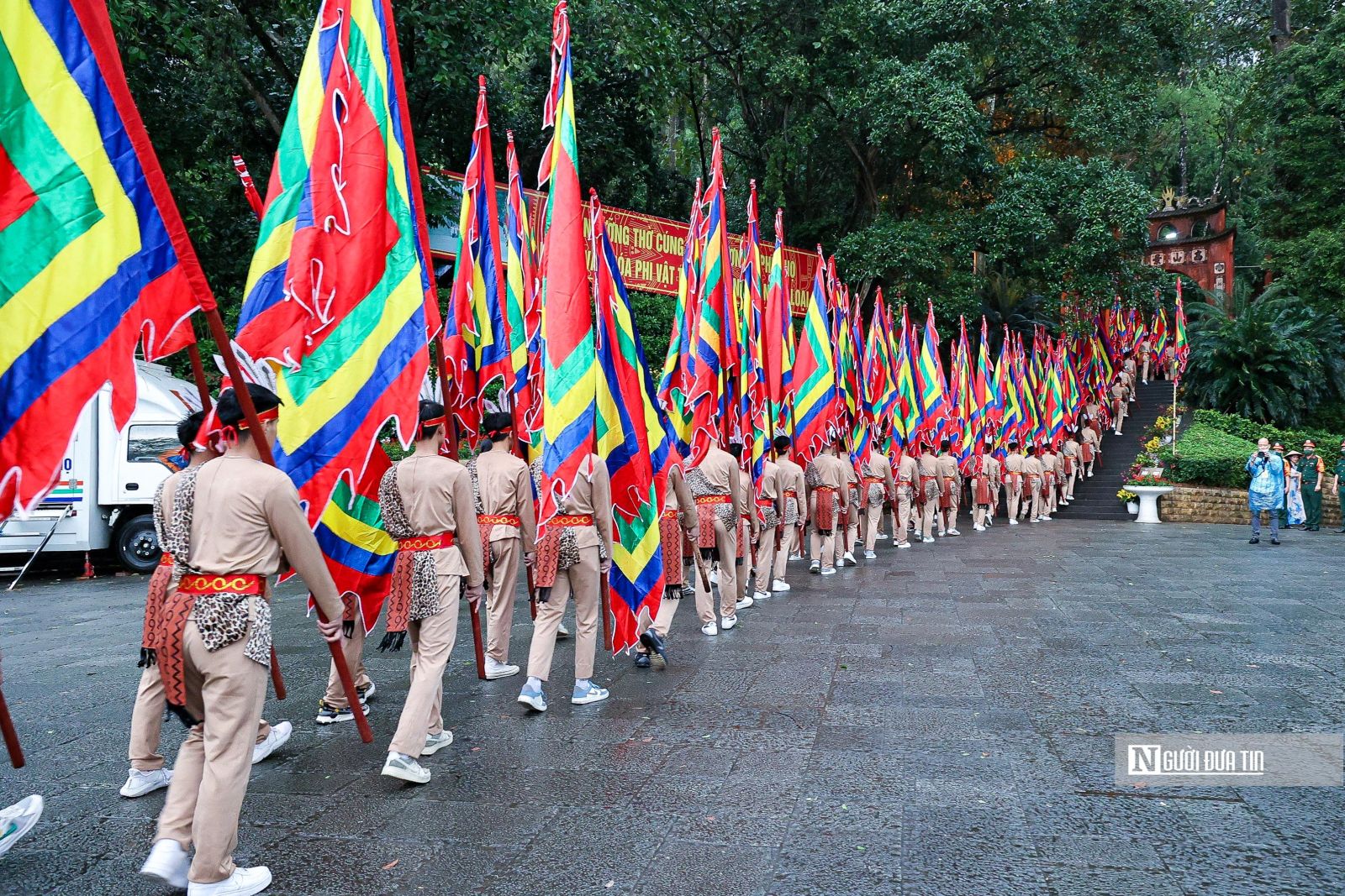 Theo sau là đoàn con cháu Lạc Hồng rước cờ Hội, đội nhạc hành lễ và đoàn kiệu rước lễ vật.