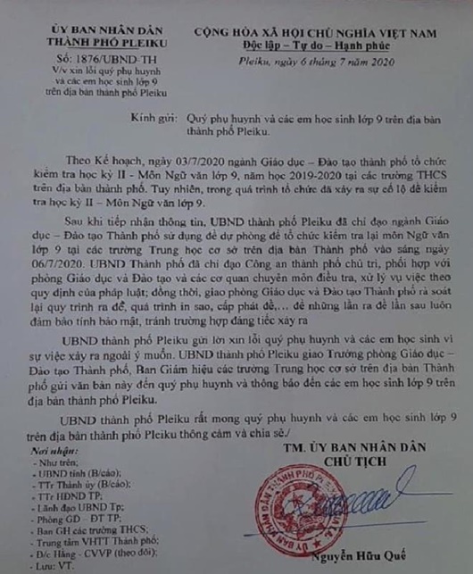 “UBND thành phố Pleiku gửi lời xin lỗi đến phụ huynh và học sinh vì sự việc diễn ra ngoài ý muốn. UBND thành phố Pleiku giao trưởng phòng Giáo dục và Đào tạo (GD&ĐT), Ban giám hiệu các trường THCS trên địa bàn gửi văn bản này đến quý phụ huynh và thông báo đến học sinh lớp 9 trên địa bàn thành phố. UBND thành phố Pleiku rất mong quý phụ huynh và các em thông cảm, chia sẻ”, văn bản xin lỗi nêu rõ.