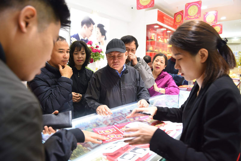 Tại các cửa hàng vàng của DOJI, Bảo Tín Minh Châu, Phú Quý, dù chưa đến mức phải xếp hàng dài và chờ cả vài tiếng như ngày vía Thần Tài năm 2018, nhưng vào trưa ngày mùng 9 tháng Giêng khách cũng phải chen chân nhau chờ mua vàng lấy may.