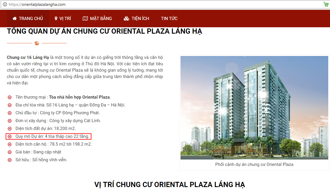 Tra thông tin trên các trang mạng, dự án được giới thiệu có vị trí đặc biệt đắc địa tại số 16 Láng Hạ (phường Thành Công, Ba Đình, Hà Nội). Chung cư Oriental Plaza là tổ hợp dự án gồm 04 tòa tháp cao 22 tầng do Công ty Cổ phần Đông Phương Phát làm chủ đầu tư tọa lạc tại vị trí kim cương 16 Láng Hạ, dự án có vị trí thuận lợi về mặt giao thông đối ngoại, tiếp cận trực tiếp với trục đường Láng Hạ là một trong những trục đường chính của Thành phố.
