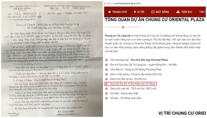 Trao đổi với một cán bộ quản lý địa bàn phường Thành Công, quận Ba Đình, vị này cho biết: “Tại dự án Oriental Plaza, Sở xây dựng đã cấp GPXD cho công trình này là 15 tầng + 1 tầng mái. Về góc độ phường vẫn đang quản lý theo GPXD cũ là 15 tầng + 1 tầng mái. Hiện tại bên phía chủ đầu tư cũng chưa cung cấp được cho phường GPXD mới. Phường cũng mới nắm bắt được thông tin rao bán nhà với quy mô là 22 tầng. Về phía hồ sơ của phường nhận được đến thời điểm hiện tại thì vẫn là GPXD cũ. Tới đây, phường cũng căn cứ vào thông tin nắm bắt được để yêu cầu chủ đầu tư giải trình cụ thể.”