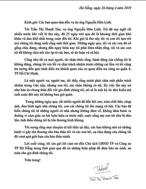 Trả lời PV, Đại tá Trần Phước Hương, Trưởng Công an quận Hải Châu nói rằng, nội dung bức thư lan truyền trên mạng chính xác do vợ ông Linh gửi đến đơn vị và Công an TP.Đà Nẵng. "Tuy nhiên, bà này đã rút đơn rồi. Bà ấy cũng đề nghị công an lưu tâm đến tình hình an ninh khu vực nhà bà", Đại tá Hương nói.