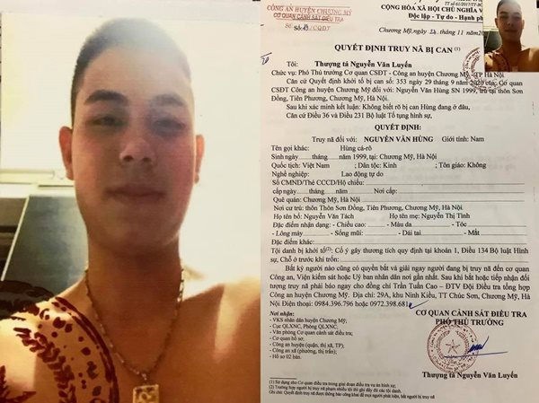 Cơ quan Cảnh sát Điều tra, Công an huyện Chương Mỹ (Hà Nội) vừa ra quyết định truy nã bị can đối với Nguyễn Văn Hùng hay còn gọi là Hùng 'cá rô' (SN 1999, trú tại Sơn Đồng, Tiên Phương, Chương Mỹ) để điều tra về hành vi "Cố ý gây thương tích".