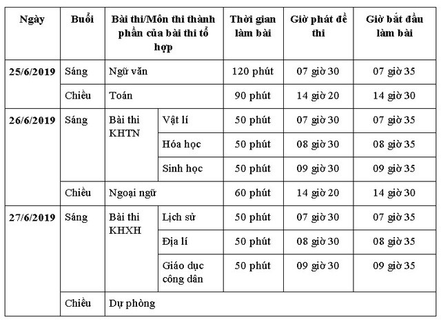 Thí sinh sẽ làm các bài thi bắt đầu từ sáng 25/6-27/6/2019, cụ thể:
