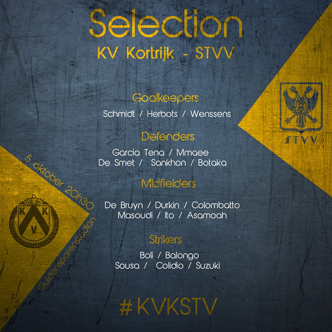 Năm cầu thủ tấn công được Sint-Truidense điền tên cho trận gặp Kortrijk là Boli, Balongo, Sousa, Colidio và Suzuki. “Messi Hàn Quốc” Lee Sung-woo tiếp tục vắng mặt vì chưa có giấy phép lao động tại Bỉ.