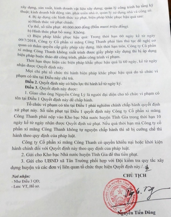 Yêu cầu trong thời gian 60 ngày (kể từ ngày 6/8/2018), Cty Xi măng Công Thanh phải làm thủ tục đề nghị cơ quan có thẩm quyền cấp giấy phép xây dựng. Hết thời gian trên, Cty Xi măng Công Thanh không xuất trình được giấy phép xây dựng thì bị áp dụng biện pháp buộc tháo dỡ công trình, phần công trình vi phạm.