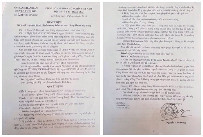 Đến ngày 17/8/2018, UBND huyện Tĩnh Gia đã ra quyết định số 5240/QĐ-XPVPHC xử phạt hành chính công ty này với số tiền 40 triệu đồng và yêu cầu dừng thi công, hoàn thiện thủ tục cấp phép về hành vi xây dựng công trình không có giấy phép xây dựng.