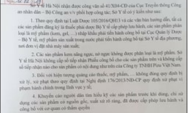 Theo văn bản của Sở Y tế Hà Nội gửi các cơ quan chức năng số 375/SYT-NVD ngày 25/01/2019 có nêu rõ: Các sản phẩm kem nâng ngực, nở ngực không được phân loại là mỹ phẩm. Sở không cấp số tiếp nhận Phiếu công bố cho các sản phẩm trên và không cấp số tiếp nhận nào cho sản phẩm có nội dung như trên của Công ty TNHH Pizu Việt Nam.