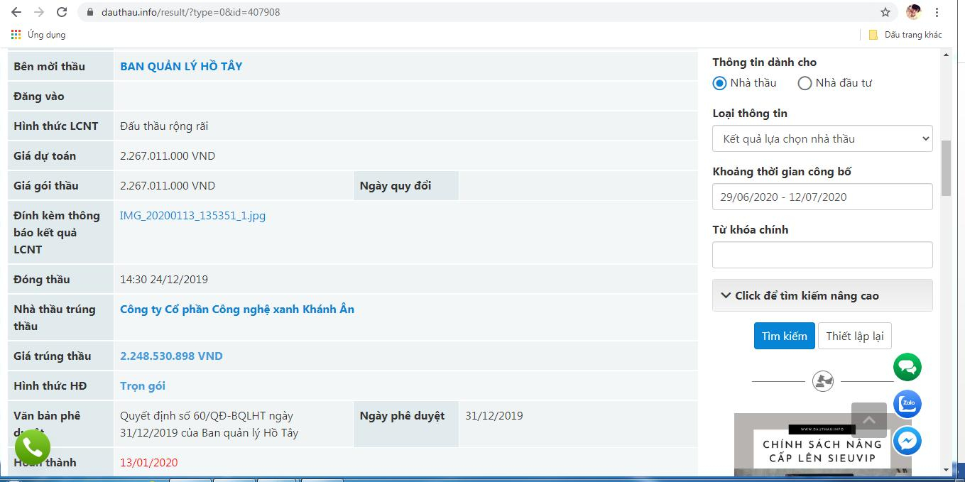 Và cũng trong ngày 31/12/2019, một gói thầu gần 49 tỷ đồng cũng về tay nhà thầu Khánh Ân khi lãnh đạo UBND quận Tây Hồ đã ký quyết định số 3586/QĐ - UBND về việc phê duyệt kết quả lựa chọn nhà thầu -gói thầu: Duy trì vườn hoa, cây xanh, thảm cỏ xung quanh Hồ Tây giai đoạn 2020 -2024 thuộc dự án Duy trì vườn hoa, cây xanh, thảm cỏ xung quanh Hồ Tây giai đoạn 2020 -2024 có giá gói thầu là 48.985.712.000 VND. Nhà thầu trúng thầu vẫn là Công ty Cổ phần Công nghệ xanh Khánh Ân với giá trúng thầu là 48.743.355.272 VND. Thời gian thực hiện hợp đồng là 1827 ngày.