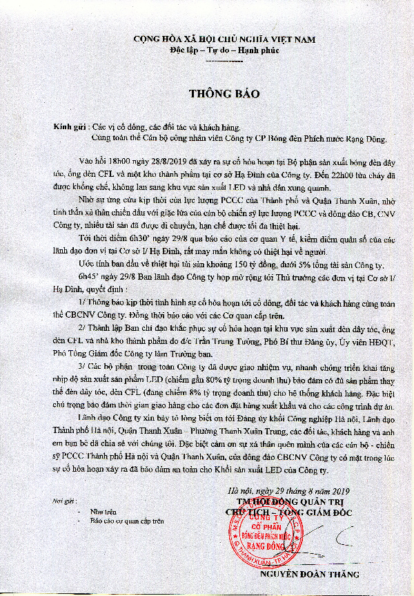 Tuy nhiên, ngay trong ngày hôm qua CTCP Bóng đèn phích nước Rạng Đông đã ra thông báo, trong đó nêu rõ thiệt hại nặng nề của doanh nghiệp này.