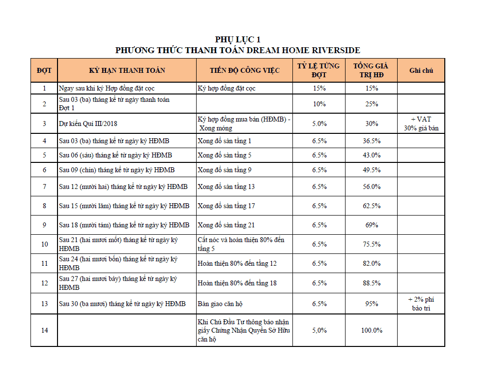 Về phương thức thanh toán Diệu cũng chia sẻ: “Theo luật của Bất động sản thì phải xong phần móng mới tiến hành ký hợp đồng mua bán được, nếu bây giờ khách hàng mua đối với dự án này thì bên em sẽ tiến hành ký hợp đồng đặt cọc gồm 3 giai đoạn (6 tháng) đến khi ký hợp đồng mua bán. Đợt đầu ký hợp đồng đặt cọc 15% hợp đồng (tương đương 180 triệu đồng) đợt 2 là 10%, đến khi ký hợp đồng mua bán là 5%”.