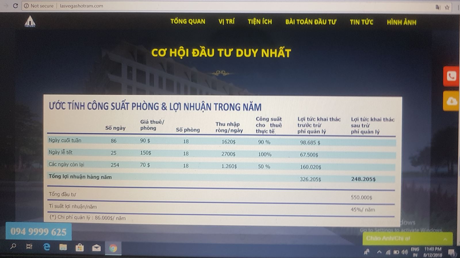 Đăc biệt hơn đối với ngày lễ tết (25 ngày) khách hàng sẽ thu được 67.500 USD/ 100% công suất phòng hoạt động với mức giá 150 USD/ phòng/ ngày. Còn đối với ngày cuối tuần (86 ngày) sẽ thu được 98.685 USD/ 90% công suất phòng cho thuê với giá 90 USD/phong/ngày. Tổng lợi nhuận khách hàng thu được từ việc cho thuê phòng khách sạn trước khi trừ chi phí quản lý sẽ lên đến 326.205 USD/năm (tương đương tỉ suất lợi nhuận /năm là 45%) so với mức tổng đầu tư ban đầu là 550.000 USD (tương đương khoảng 13 tỷ đồng).