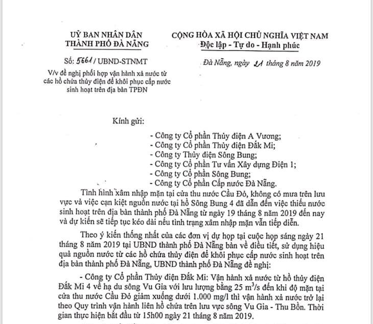 Cụ thể, công ty CP Thủy điện Đắk Mi vận hành xả nước từ hồ thủy điện Đắk Mi 4 về hạ du sông Vu Gia với lưu lượng bằng 25m3/s, đến khi độ mặn tại cửa thu nước Cầu Đỏ giảm xuống dưới 1.000 mg/l thì vận hành xả nước trở lại theo Quy trình vận hành liên hồ chứa trên lưu vực sông Vu Gia - Thu Bồn. Thời gian thực hiện bắt đầu từ 15h chiều 21/8.