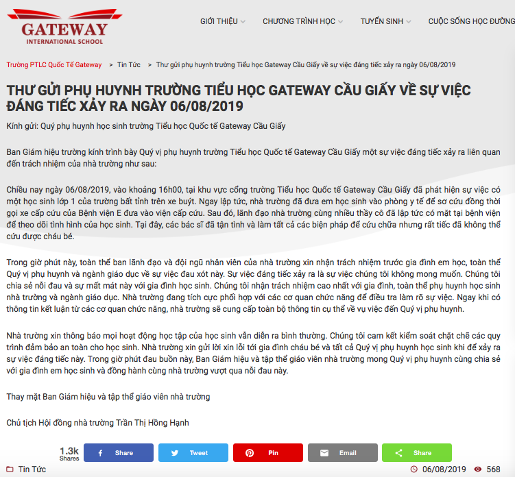 Trong thông báo gửi tới phụ huynh nhà trường lúc 22h30 đêm 6/8, Ban giám hiệu trường GateWay cho hay: “Vào khoảng 16h00 ngày 6/8, phát hiện sự việc có một học sinh lớp 1 của trường bất tỉnh trên xe buýt, ngay lập tức, nhà trường đã đưa em học sinh vào phòng y tế để sơ cứu đồng thời gọi xe cấp cứu của Bệnh viện E đưa ngay vào viện. Sau đó, lãnh đạo nhà trường cùng nhiều thầy cô đã lập tức có mặt tại bệnh viện để theo dõi tình hình của em. Tại đây, các bác sĩ đã tận tình và làm tất cả các biện pháp để cứu chữa nhưng rất tiếc là em đã không thể qua khỏi”.