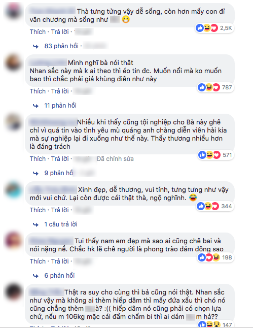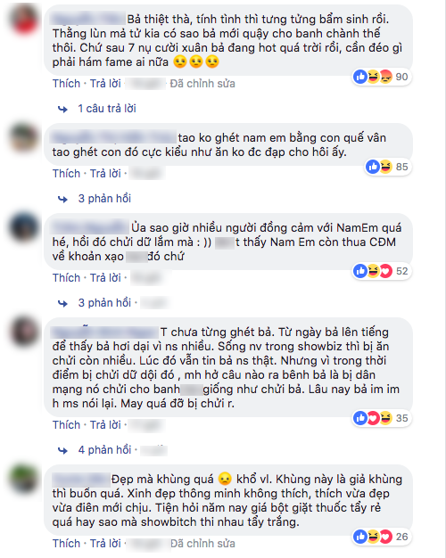 Tuy phát ngôn có gây sốc nhưng nhiều ý kiến cho rằng Nam Em nói thật trong chuyện này. Từ gay gắt với người đẹp gốc Tiền Giang khi scandal giữa cô và Trường Giang – Nhã Phương nổ ra, nay khán giả đã phần nào đồng cảm trước câu chuyện của chân dài sinh năm 1996.