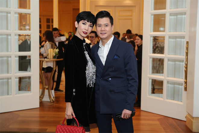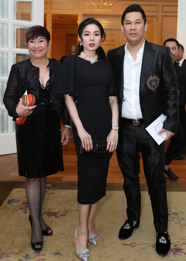 Vợ chồng Lệ Quyên (phải) có mối quan hệ thân thiết với Lê Hiếu. Họ diện đồ cùng tông đen dự tiệc.