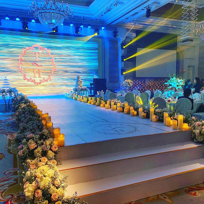 Lễ đường ngập tràn hoa tươi và nến lấp lánh của Lê Hiếu và Thu Trang. Ngay chính giữa sân khấu là 1 màn hình led lớn với chữ cái đầu trong tên của cô dâu chú rể được lồng ghép rất tinh tế.