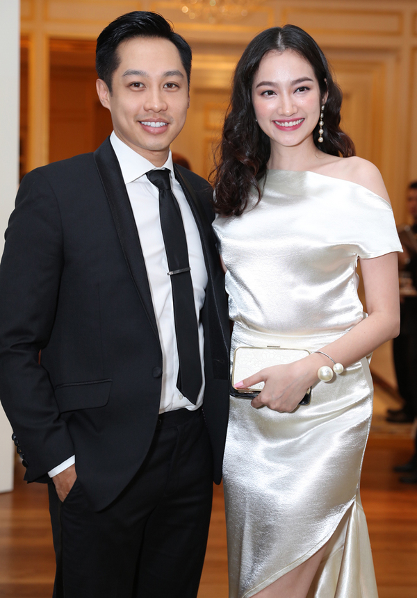 Dễ dàng nhận thấy bà xã 9X của Lê Hiếu sở hữu nhan sắc vô cùng xinh đẹp, cuốn hút. Đứng cạnh các vị khách mời nổi tiếng, Thu Trang không hề thua kém.