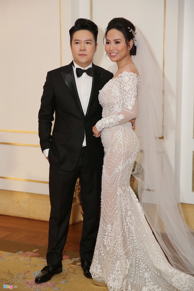 Nam ca sĩ chọn vest đen phom dáng cổ điển. Bà xã Lê Hiếu gợi cảm trong váy cưới màu trắng ôm sát cơ thể. Vòng hai của cô có phần tròn trịa.