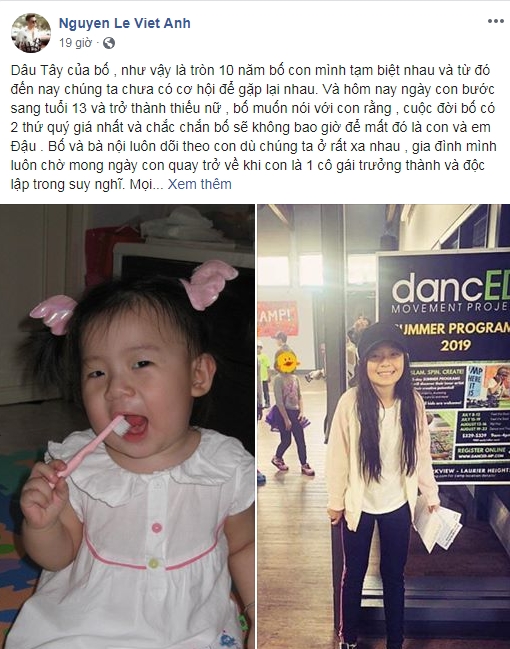 "Việt Anh, tôi yêu cầu anh gỡ ngay post này xuống. Đây là hình cá nhân của con tôi, và tôi không cho phép anh dùng post trên trang công cộng của anh. Đừng giả tạo nữa. Từ chối và tránh né trách nhiệm với con mà thể hiện như yêu thương nó thật vậy. 10 năm trời, 1 món quà, 1 cái thiệp hay chỉ 1 tin nhắn chúc mừng cũng không có. Con mới 12 tuổi mà tính ra tới 13 thì phải biết anh thương con tới cỡ nào rồi.