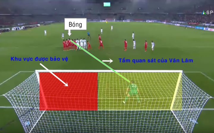 Khi lập hàng rào, nguyên tắc của thủ môn là phải tin tưởng tuyệt đối rằng đối phương sẽ không thể sút xuyên qua hàng rào để đi vào khu vực được bảo vệ (ở trong hình là khu vực màu đỏ). Thủ môn chỉ phải lo bảo vệ khu vực màu vàng. Một nguyên tắc khác là thủ môn phải luôn quan sát được bóng. Đó là lý do tất cả các thủ môn, không chỉ Văn Lâm, luôn đứng lệch hẳn về một phía, tạm gọi là phía xa bóng. Thủ thành của Việt Nam, vì thế, đã không sai ở khâu chọn vị trí và lập hàng rào.