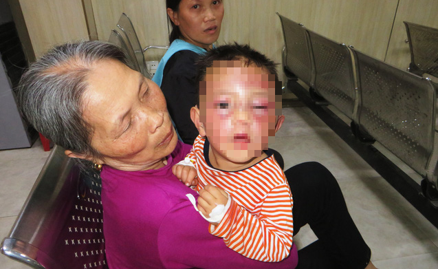 Trước đó, vào chiều 27/3, phòng khám đa khoa Quang Khởi (TX Hoàng Mai) tiếp nhận cấp cứu bé H.P.H. (2 tuổi) trong tình trạng thâm tím mặt, hai mắt sưng. Bé H. không ăn và không nói được.