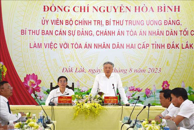 Tại buổi làm việc, ông Nguyễn Hòa Bình đánh giá cao kết quả thực hiện nhiệm vụ của Tòa án nhân dân hai cấp tỉnh Đắk Lắk thời gian qua, khi tỉnh có số lượng án cao hơn mặt bằng chung cả nước; chất lượng giải quyết, xét xử các loại án tốt; tỷ lệ hủy, sửa án thấp hơn quy định…