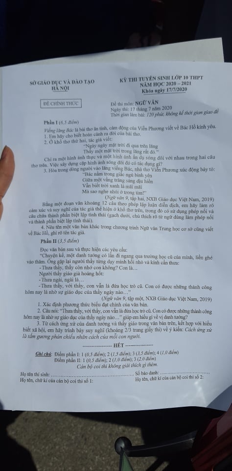 Đề thi môn Ngữ Văn tuyển sinh lớp 10 năm 2020 chính thức tại TP.Hà Nội: