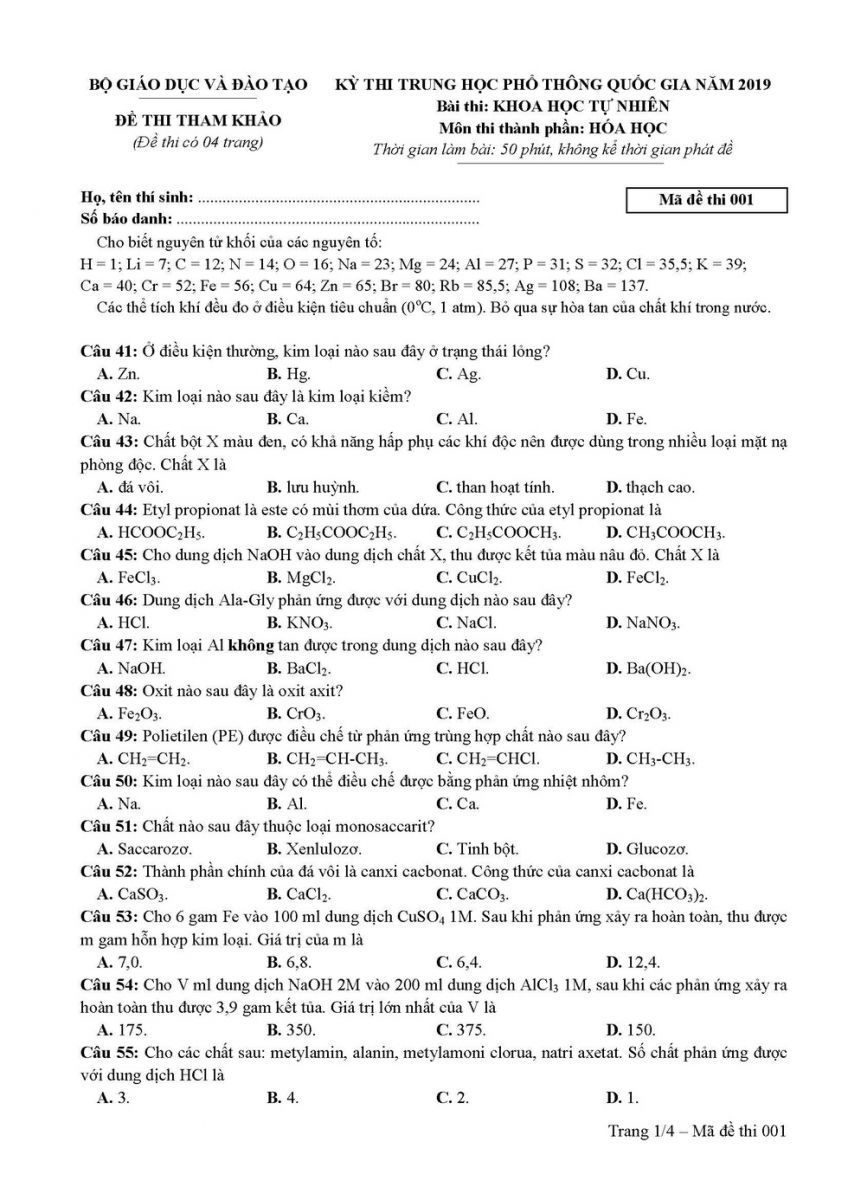 Đề thi tham khảo môn Hoá thi THPT Quốc gia năm 2019: