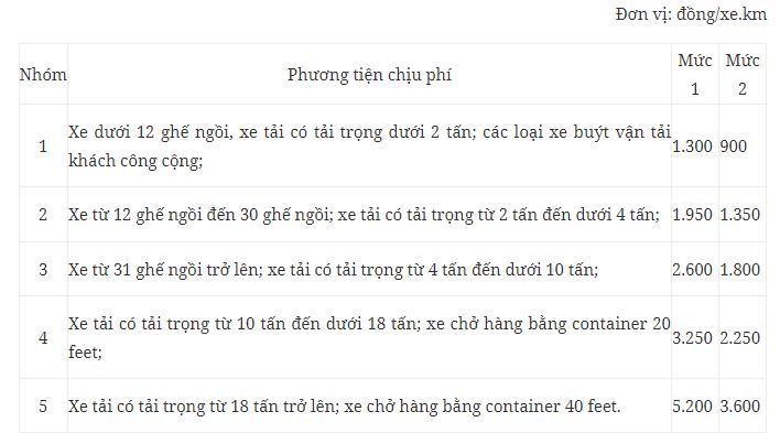- Nhóm 5 gồm các loại phương tiện sau: Xe tải có tải trọng từ 18 tấn trở lên; xe chở hàng bằng container 40 feet.