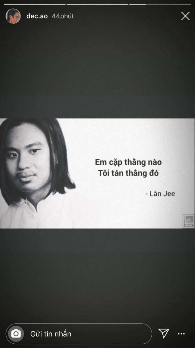 Chưa dừng lại, Decao còn đăng thêm 1 story nữa, với nội dung: "Em cặp thằng nào, tôi tán thằng đó", như 1 lời "tuyên chiến" đến Châu Bùi.