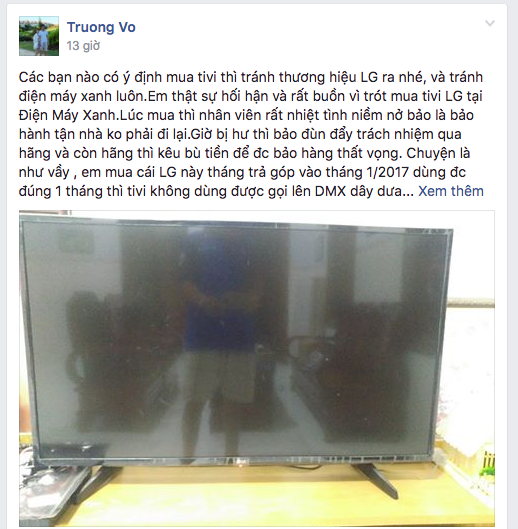 Bức xúc với cách làm việc thiếu trách nhiệm, anh Trương đã chia sẻ và cảnh báo người dùng nên tránh xa thương hiệu LG và cả Điện Máy Xanh.