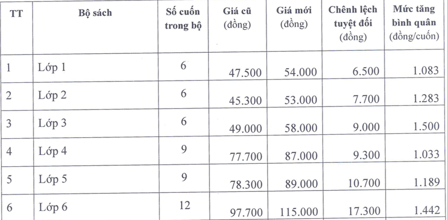 Theo phương án, SGK sẽ được điều chỉnh tăng thấp nhất là bộ sách lớp 1, tăng 6.500 đồng (từ 47.500 đồng lên 54.000 đồng/bộ); tăng cao nhất là bộ SGK lớp 12 chương trình chuẩn, tăng 25.800 đồng (từ 154.200 đồng lên 180.000 đồng/bộ). Tính bình quân giá sách tăng từ 1.000 đến 1.800 đồng/cuốn. Với phương án điều chỉnh giá SGK sẽ làm tăng CPI năm 2019 là 0,07%.