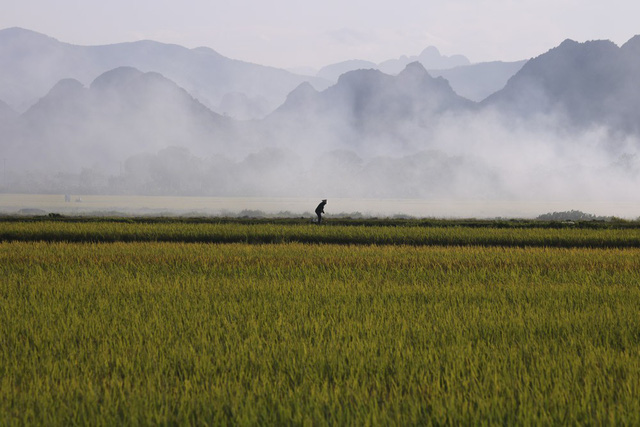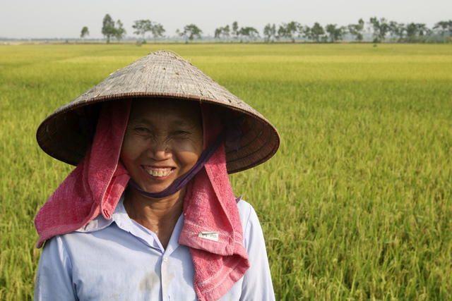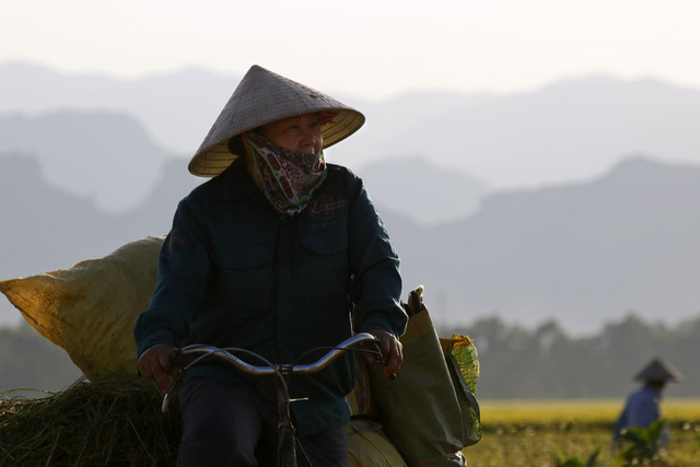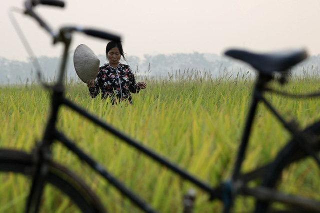 Một nông dân đang đi thăm đồng trên thửa ruộng đã chín vàng. Chị cho biết đang sốt ruột chờ máy là gặt ngay, mùa này mưa bão bất chợt là thiệt hại, thà "xanh nhà hơn già đồng".