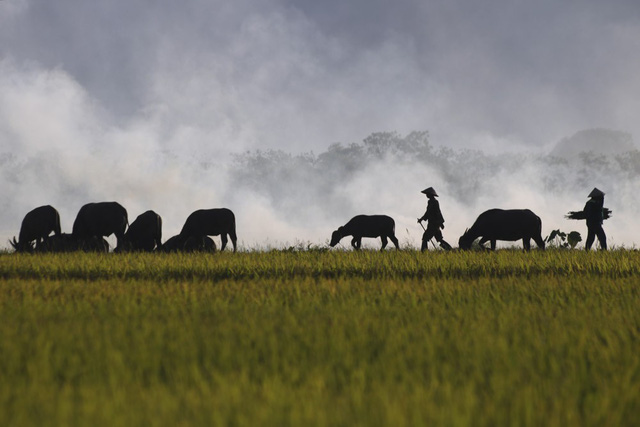 Anh Ngô Văn Thi đang thả trâu bên cánh đồng lúa xã Phúc Lâm. Nhà anh có 10 con trâu, mỗi năm bán 2-3 con với giá từ 20-30 triệu/con.