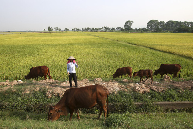 Một phụ nữa đang chăn thả đàn bò trên cánh đồng trải dài ngút tầm mắt ở xã Phúc Lâm.