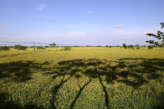 Bóng rặng xoan in trên cánh đồng lúa tạo thành những mảng miếng trông khá lạ mắt.