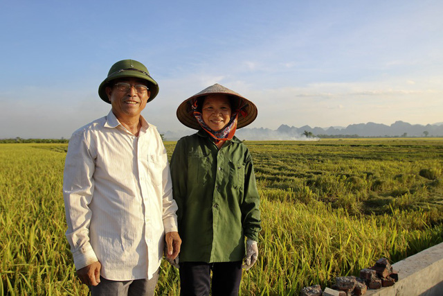 Chân dung những người nông dân Mỹ Đức bên đồng ruộng. Vợ chồng bác Nguyễn Ngọc Uyên và Ngô Thị Thuấn có tất cả 4 sào ruộng, năm nay lúa được mùa, mỗi sào cũng cho thu hoạch khoảng 2,8 tạ thóc.