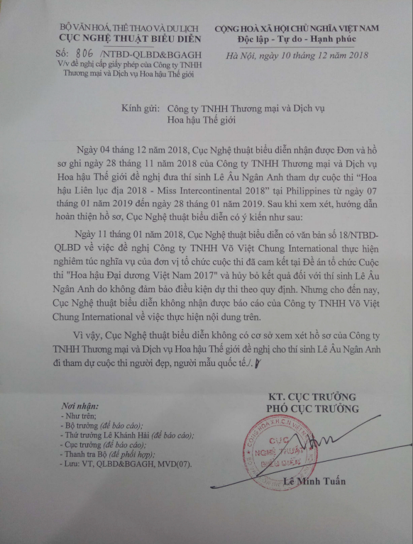 Trước đó, ngày 3/12, Công ty TNHH Thương mại và Dịch vụ Hoa hậu Thế giới nộp hồ sơ xin cục NTBD cấp phép cho Lê Âu Ngân Anh tham dự cuộc thi Hoa hậu liên lục địa (Miss Intercontinental 2018).