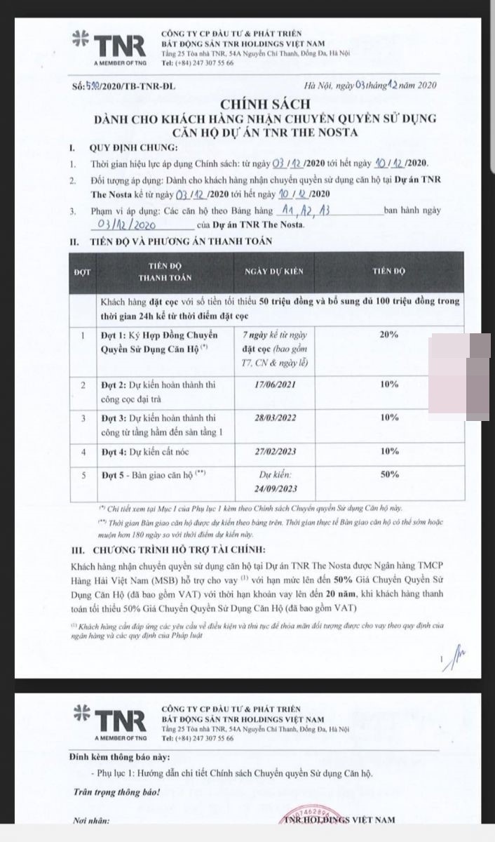 Cụ thể, ngày 03/12/2020 TNR Holdings Việt Nam ra văn bản số 510/2020/TB-TNR-ĐL đưa ra chính sách dành cho khách hàng nhận quyền sử dụng căn hộ tại dự án TNR The Nosta. Chính sách này áp dụng từ ngày 03/12/2020 tới ngày 10/12/2020, đối tượng áp dụng là dành cho các khách hàng nhận chuyển quyền sử dụng tại căn hộ dự án TNR The Nosta.