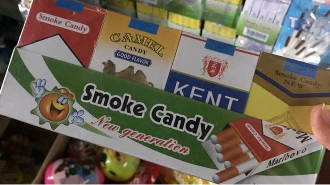 Đứng ở cổng trường T.L. giờ tan học, chúng tôi bắt gặp một tốp học sinh vào quán tạp hóa cách trường không xa mua 2 gói “smoke Candy New- 888”. Thật bất ngờ, các em bóc “bao thuốc” ra và ngậm, phì phèo như đang hút thuốc lá thật.