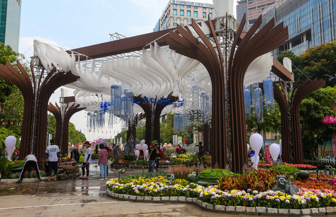 Sau nửa tháng thi công, đường hoa Nguyễn Huệ xuân Kỷ Hợi đã hoàn thiện cơ bản để kịp khai trương vào 28 Tết. Đây là năm thứ 16, TP HCM tổ chức đường hoa.