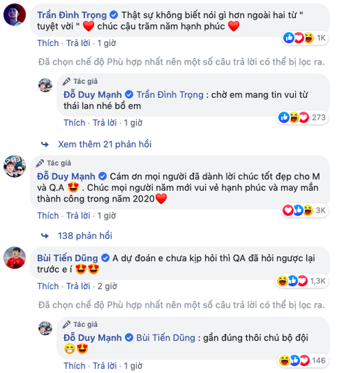 Dòng status của Duy Mạnh và Quỳnh Anh nhanh chóng nhận được nhận được "mưa" lời chúc mừng hạnh phúc, cùng hàng nghìn lượt chia sẻ từ cộng đồng mạng, dàn cầu thủ Việt Nam cũng không thể không góp vui. Nhiều người gửi lời chúc đến Duy Mạnh và Quỳnh Anh khi đến được bến bờ hạnh phúc sau hành trình nhiều năm yêu, bên cạnh đó còn đưa ra gợi ý về đám cưới như: tổ chức ở SVĐ Mỹ Đình hoặc Hàng Đẫy, làm 700 mâm, mời hết nửa miền Bắc... Có vẻ như ai cũng rất háo hức với đám cưới cổ tích sắp tới này. Đặc biệt "quàng tử" Đức Huy đã chấm một chỗ trong đội hình bê tráp cho chú rể Duy Mạnh.