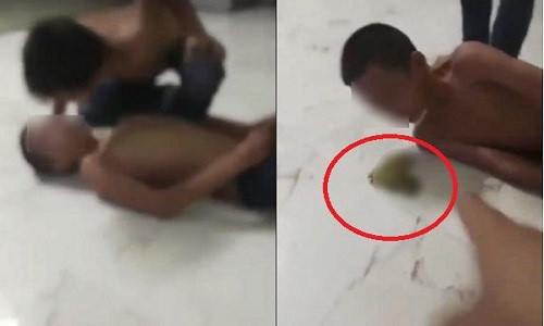 Khi người em trai vừa nhổ nước bọt vào miệng, cậu bé không chịu nổi mà nôn ói ra trước sàn nhà. Thấy vậy, ông bố tiếp tục bắt cậu em dùng thức ăn vừa ói ra thoa lên mũi người anh.