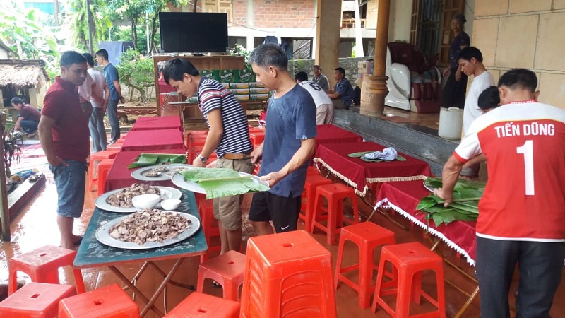 Từ rất sớm, anh em bạn bè, người dân địa phương đã tập trung tại nhà ông Nguyệt để phụ giúp gia đình làm thịt trâu, dựng rạp …