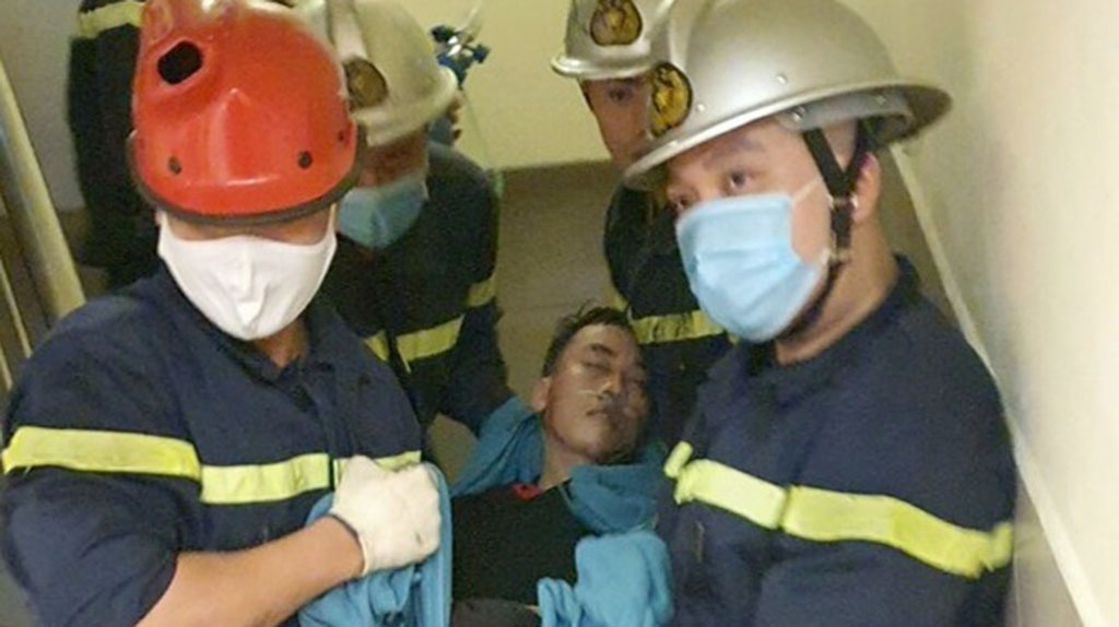 Sau khoảng 30 phút, Đội Cảnh sát phòng cháy chữa cháy và cứu nạn cứu hộ Công an Q.Đống Đa đã phối hợp với Công an P.Quốc Tử Giám đưa anh M ra ngoài an toàn, dùng vải làm cáng đưa xuống tầng 1 theo lối thang bộ để đi cấp cứu.