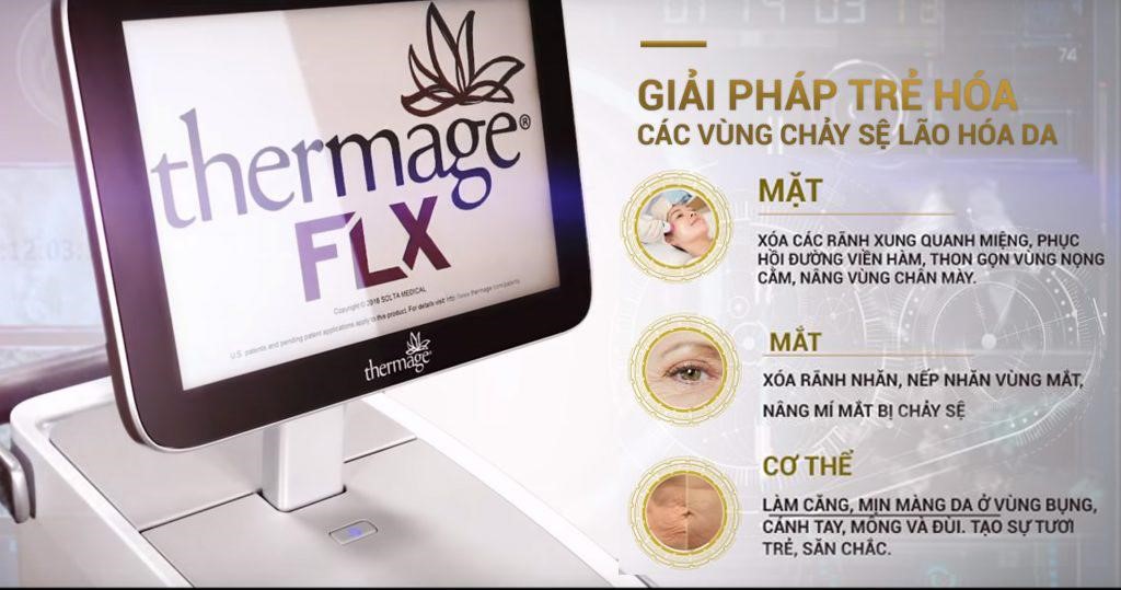 Thermage FLX là phiên bản trẻ hóa thế hệ thứ 4 của dòng thiết bị Thermage, được ứng dụng năng lượng sóng tần số vô tuyến điện dung đơn cực, tác động tới tầng sâu của da, tạo nhiệt năng giúp co thắt bó cơ, đồng thời kích thích quá trình sản sinh collagen. Chỉ 1 lần thực hiện, Thermage FLX giúp cải thiện tối đa đến 84% các dấu hiệu lão hóa, giúp da đàn hồi, căng bóng có thể cảm nhận ngay bằng mắt thường.