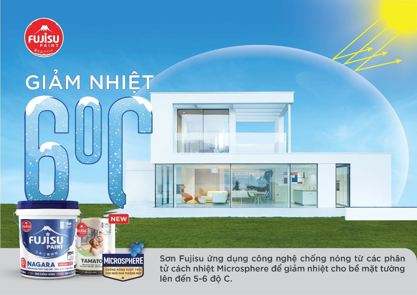 Chính vì vậy, sơn Fujisu đã ứng dụng công nghệ chống nóng từ các phân tử cách nhiệt Microsphere để giảm nhiệt cho bề mặt tường, đưa đến chất lượng sơn chống nắng tốt cho mọi gia đình. Microsphere là những phần tử tương tự như những quả bóng bằng sứ rất nhỏ, hoàn toàn rỗng. Chúng đẩy tất cả không khí ra ngoài và tạo một môi trường chân không, ngăn cản sức nóng bằng cách bức xạ nhiệt khi sức nóng vừa chạm vào bề mặt tường, làm giảm nhiệt độ lên đến 5-6 độ C.