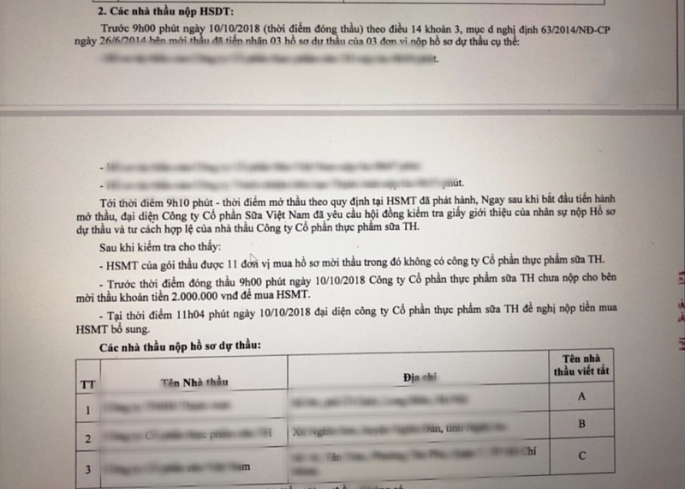 Vào lúc 9h20 phút, đại diện tham dự Lễ mở thầu của Công ty CP Sữa Việt Nam đã yêu cầu Bên mời thầu kiểm tra giấy giới thiệu của nhân sự nộp HSDT và tư cách hợp lệ của nhà thầu Công ty CP Thực phẩm sữa TH. Tổ chuyên gia xác nhận, Công ty CP Thực phẩm sữa TH không nằm trong danh sách 11 đơn vị đã mua HSMT gói thầu trên. Trong danh sách 11 nhà thầu đã mua HSMT chỉ có Công ty CP Chuỗi thực phẩm TH (1 pháp nhân độc lập với Công ty CP Thực phẩm sữa TH).